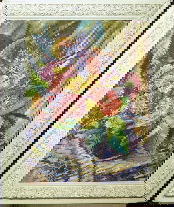 James Holland. Massachusetts. "White and Red". Still life of white flowers in a red glass bottle setJames Holland. Massachusetts. "White and Red". Still life of white flowers in a red glass bottle set against a black ground. Oil on panel. Framed. Sherry French Gallery, NY label on reverse with artis