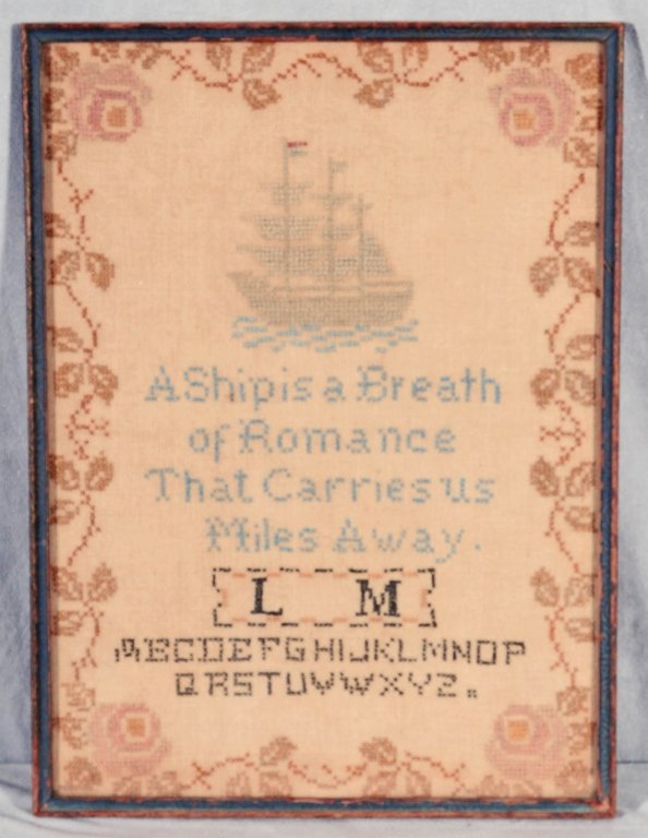 FRAMED SAMPLER. SHIP DECORATION. MONOGRAMMED "L M."