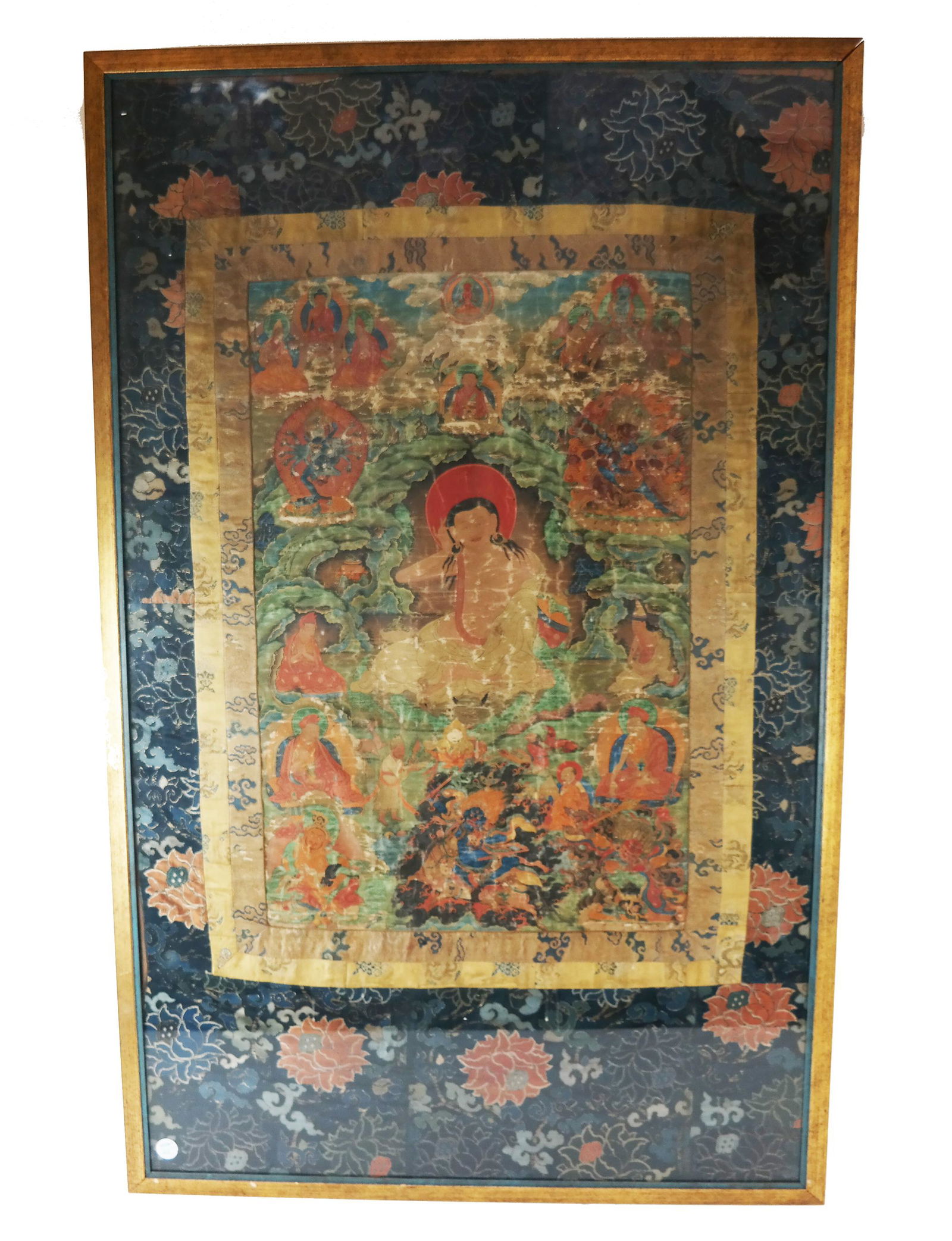 SoldAN ANTIQUE FRAMED TIBETAN THANGKA PAINTING,AN ANTIQUE FRAMED TIBETAN THANGKA PAINTING, 23 1/2" x 16" Provenance: Estate of the late Charles A. and Betti F. Saunders, Houston, Texas.See Sold Price