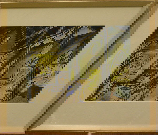 SoldJAMES MARTIN CHESHIRE CAT Framed WatercolorPiece is marked MARTIN CHESHIRE CAT. Depicts a female figure seated on a bed while a cat is seated on a dresser. Piece is professionally framed with pink toned frame. Measures approx 15.5 inches longSee Sold Price