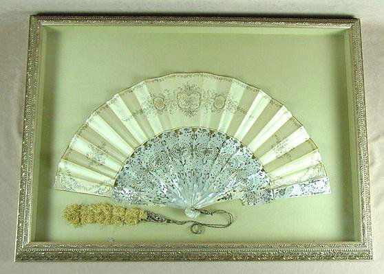 SoldWhite Celluloid Brise Fan, With Tassel, FramedWhite celluloid brise hand fan, joined with white satin ribbon, framed under glass. [Fan: 8 x 13 inches; Frame: 1 x 18 1/2 x 21 1/2 inches]. In good condition.See Sold Price