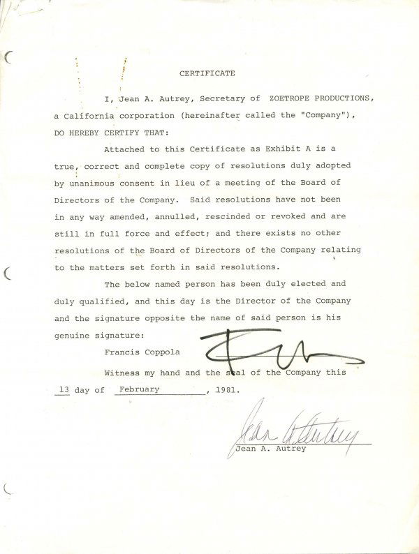 Francis Ford Coppola Document Signed UACC P