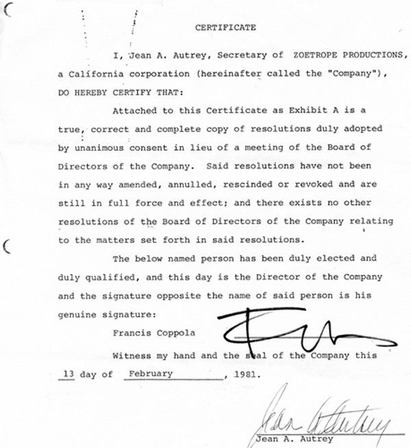 Francis Ford Coppola Document Signed UACC PADA