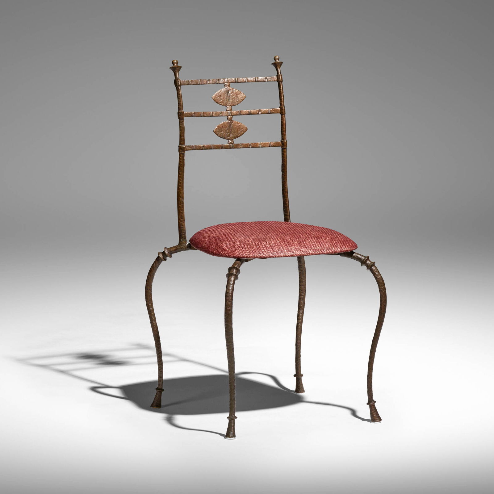 SoldCarlo Bugatti, Hall chairCarlo Bugatti Hall chair Italy, c. 1900lacquered parchment over wood, vellum, copper 35.25 h x 16.25 w x 18.5 d in (90 x 41 x 47 cm) Provenance: Sotheby's, London, AppliedSee Sold Price
