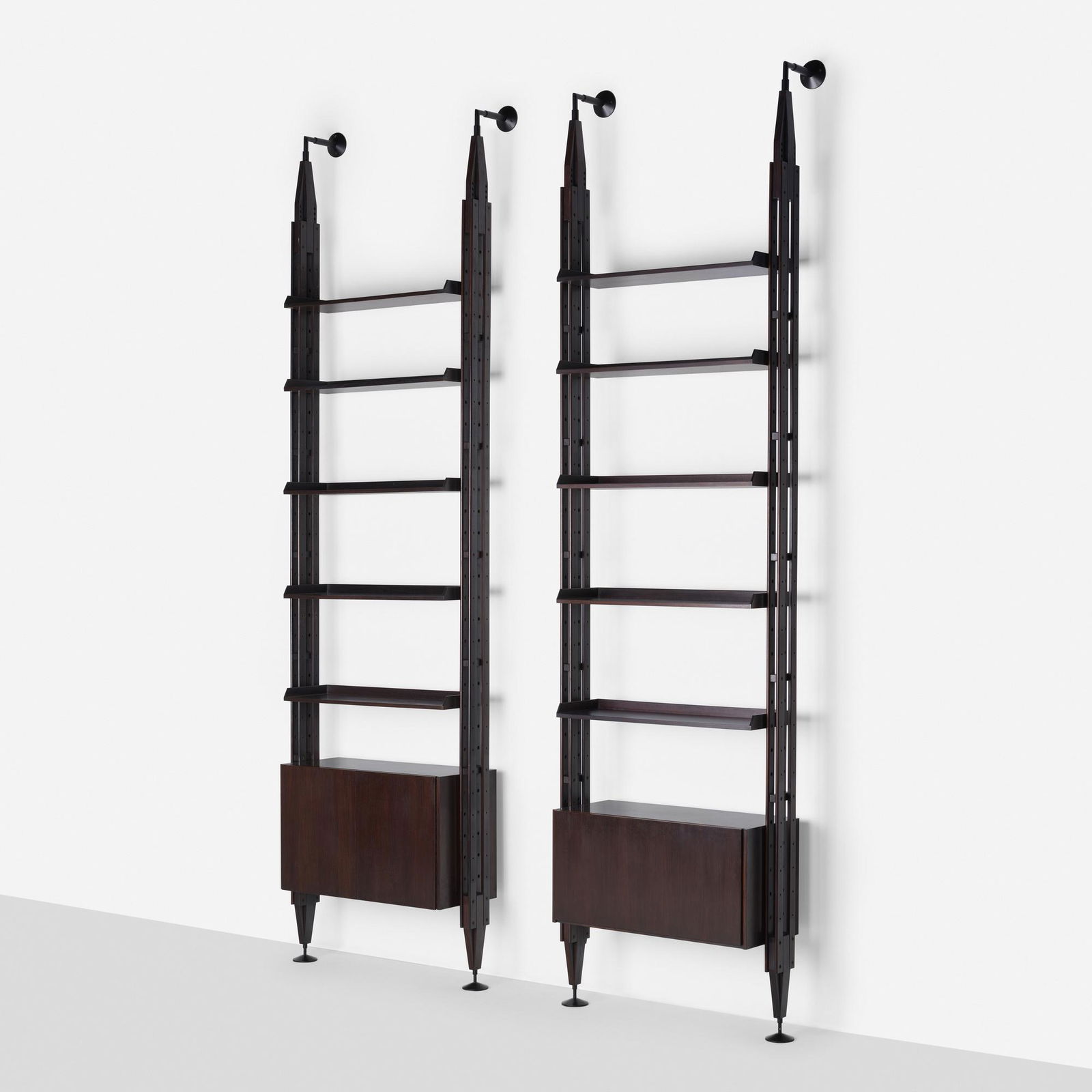 SoldFranco Albini (1905 - 1977) - Libreria modello "LB7".Franco Albini (1905 - 1977) - Libreria modello "LB7". Produzione Poggi, Pavia, anni 60 (disegno 1956) Montanti in massello di noce, ripiani, vassoi e stipo in paniforte contornato e placcato in palissSee Sold Price