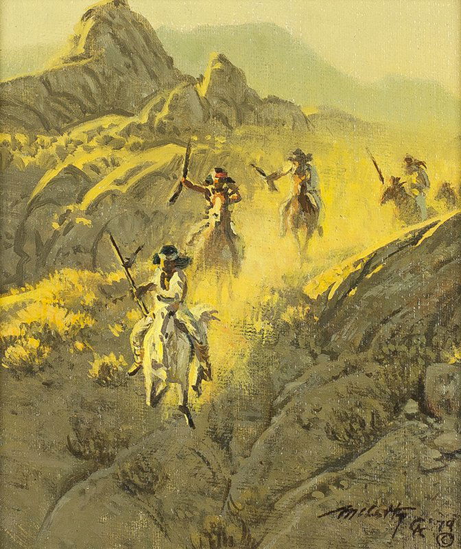 SoldFrank McCarthy (1924-2002) The Pursuit, 1980Frank McCarthy (1924-2002) The Pursuit, 1980 oil on canvas 24 x 30 inches 35 x 40.5 inches (frame) signed lower right: McCarthy CA 1980 verso: titled, signed, and dated “Many Indians, such as the ApSee Sold Price
