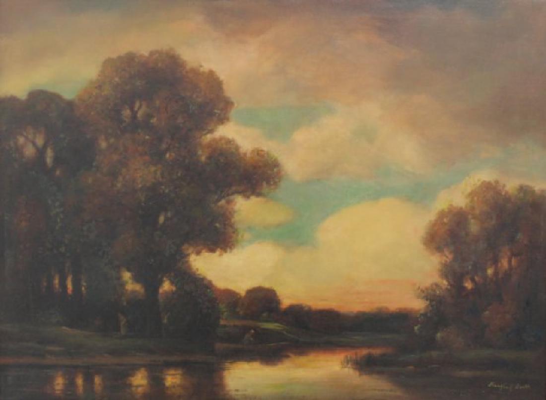 SoldPainting, landscape with figure, Franklin E. Booth, oil on canvas, landscape under twilight skiesPainting, landscape with figure, Franklin E. Booth, oil on canvas, landscape under twilight skies with figure in small boat crossing stream, canvas is 24" by 30" Part of a collection of art belongingSee Sold Price