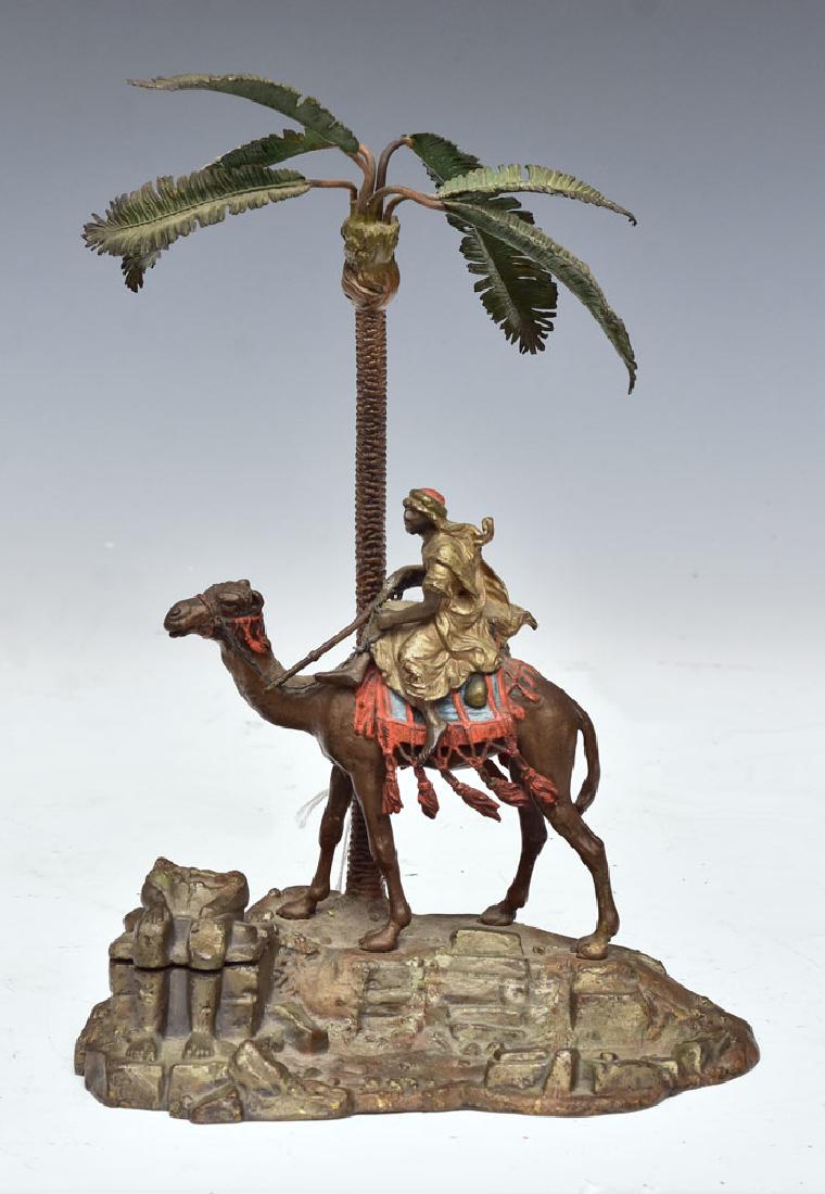 SoldFranz Bergman Style Bronze InkwellDESCRIPTION: A Franz Bergman style bronze depicts two Arabian carpet sellers, one standing and the other atop a camel. The bronze is embellished with cold painted accents, a pen insert unscrews revealSee Sold Price