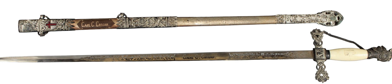SoldTwo Fraternal SwordsKnights of Columbus with 25 3/4" blade made by Lynch & Kelly, NY. Other is presentation sword with fully etched blade by George Fletched, Balt., inscribed to M. Raymond Roberts. Blade is 26" L. ScabbaSee Sold Price