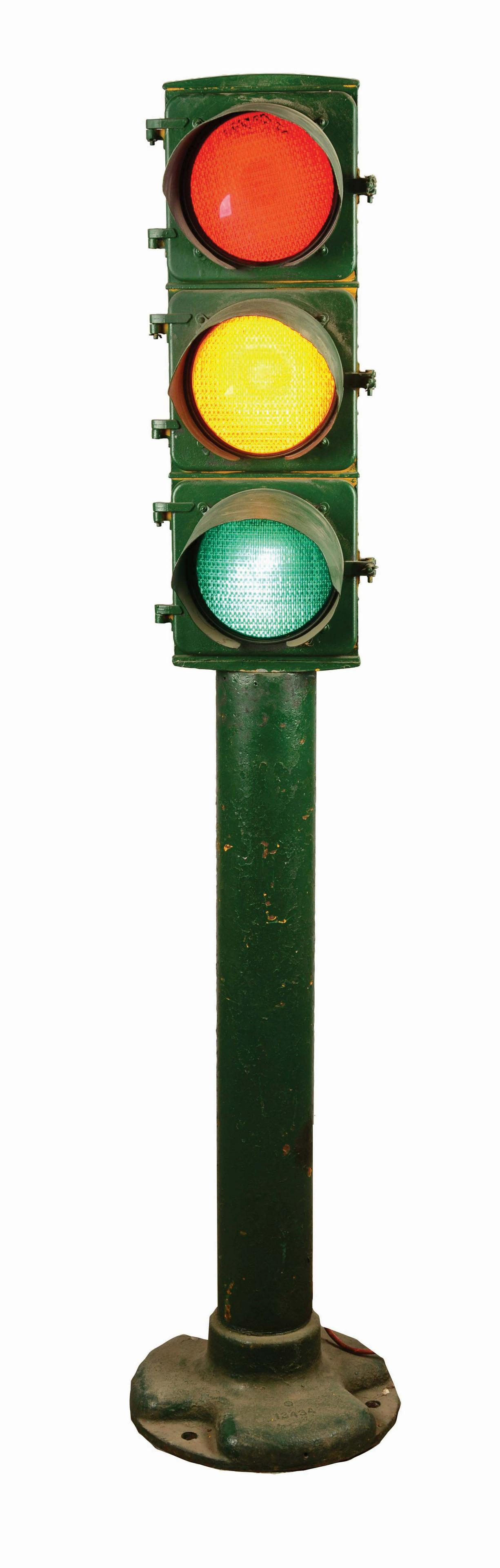 SoldFreestanding Traffic Signal.Manufactured by the Eagle Signal Corp, this signal has the traditional red, yellow, green stack of lights with sheet metal cowling and a heavy cast iron base painted green. Paint is flaking off and thSee Sold Price