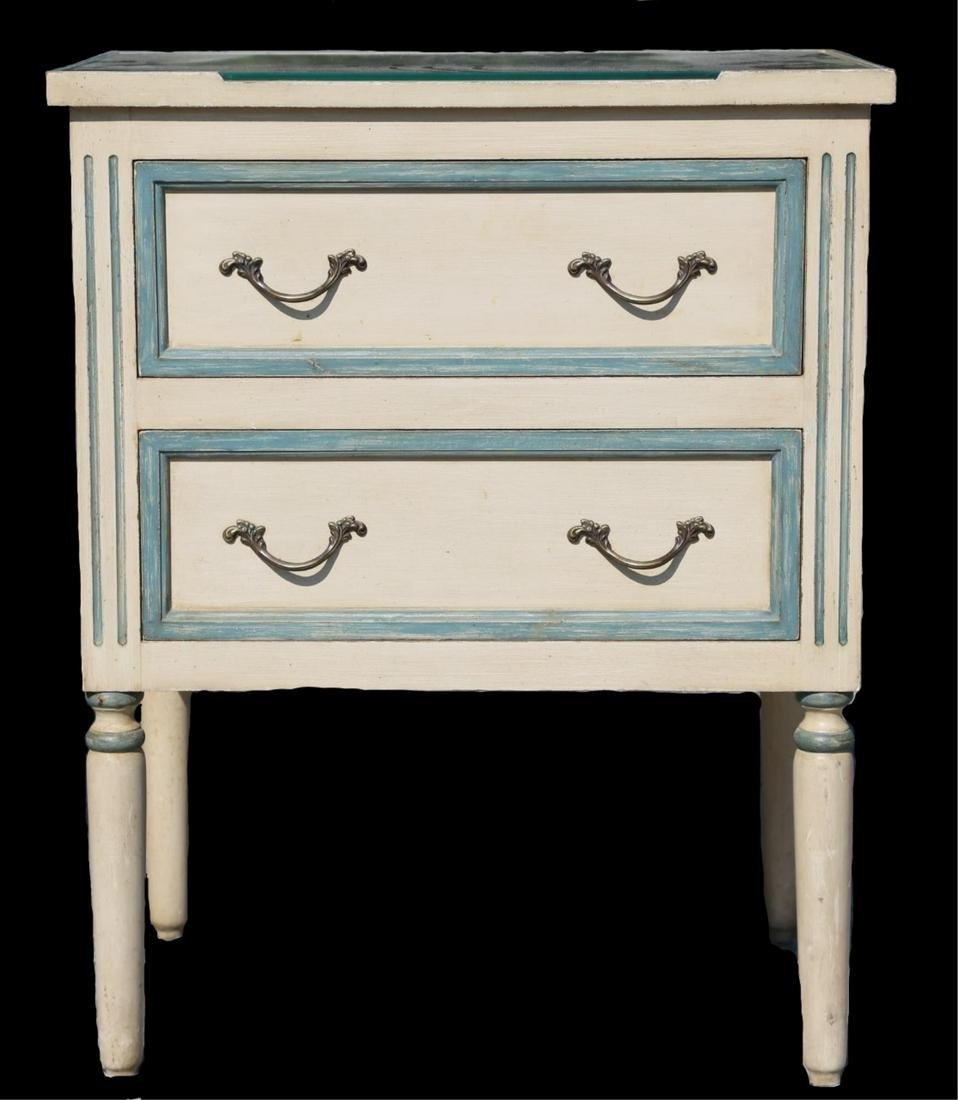 FRENCH ANTIQUE PAINT DECORATED TWO DRAWER STAND