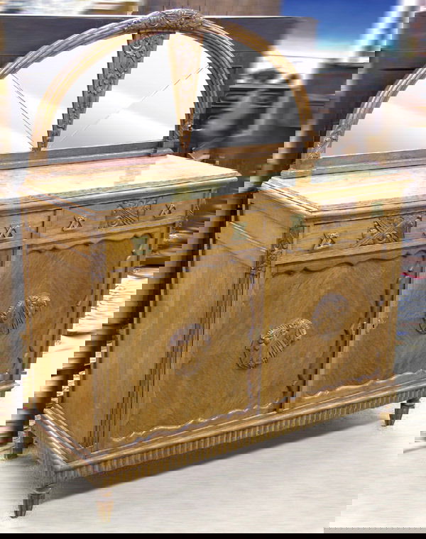 SoldFRENCH ART DECO OAK BUFFETFrench Art Deco oak buffet with fruit carving accents and beveled glass. Approximate dimensions: h. 83", w. 55.25", d. 19" Disclaimer: This is an online court ordered bankruptcy sale. Participating biSee Sold Price