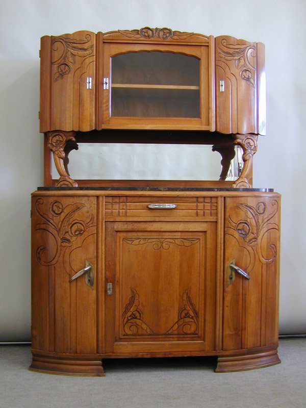 SoldFRENCH ART DECO WALNUT & MARBLE BUFFETFrench Art Deco walnut and marble buffet, 20th c., the entirety with marble top, having carved foliate and floral accents, geometric shaped beveled plate mirror, above the two single shelf fitted cabiSee Sold Price