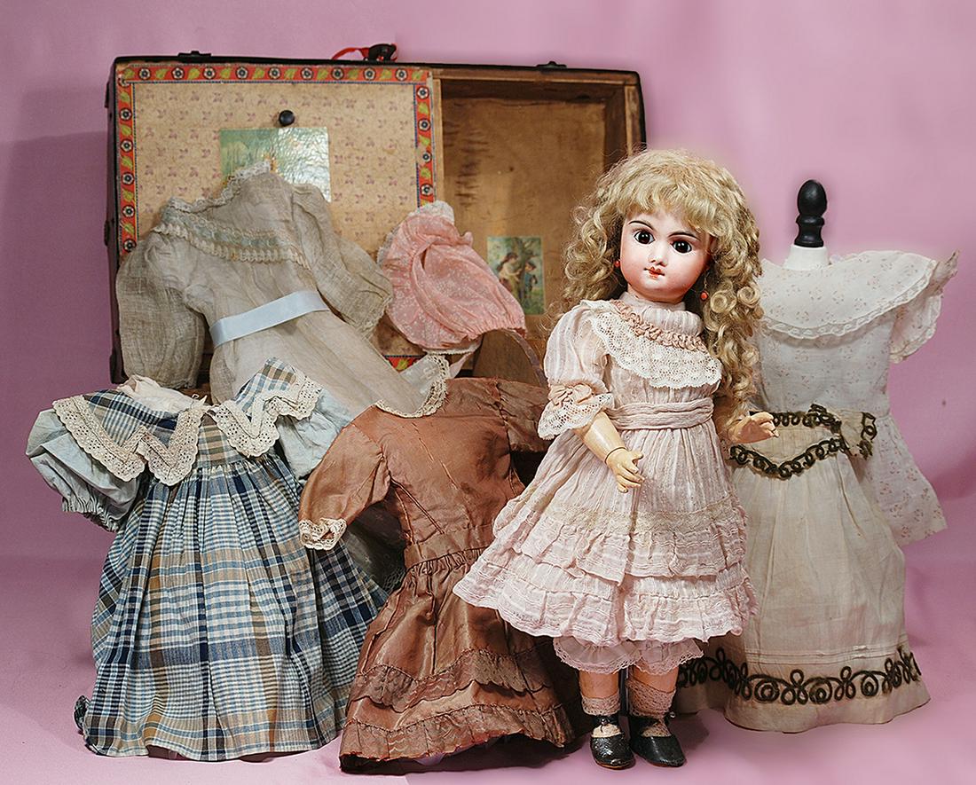 FRENCH BISQUE BEBE "M" WITH TRUNK AND WARDROBE.