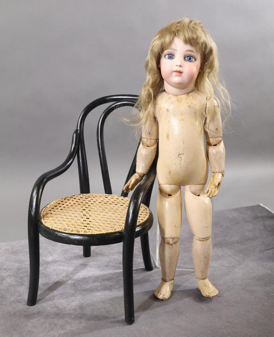 Sold4 German & French Bisque DollsDESCRIPTION: Two marked S&H. Three with paperweight eyes. PROVENANCE: Private collection. MEASUREMENT: 13-1/4" to 16" long. CONDITION: Three with wigs not secured to skull cap.See Sold Price