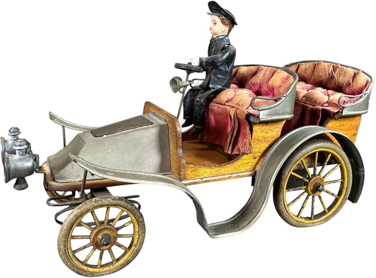 SoldGERMAN FOUR SEAT OPEN TOURER46. GERMAN FOUR SEAT OPEN TOURER | Germany, c. 1905-1910, attributed to Karl Bub, lithographed tin, working wind-up motor. | 9" l. | Car is all original and figures are high quality replacements, overSee Sold Price