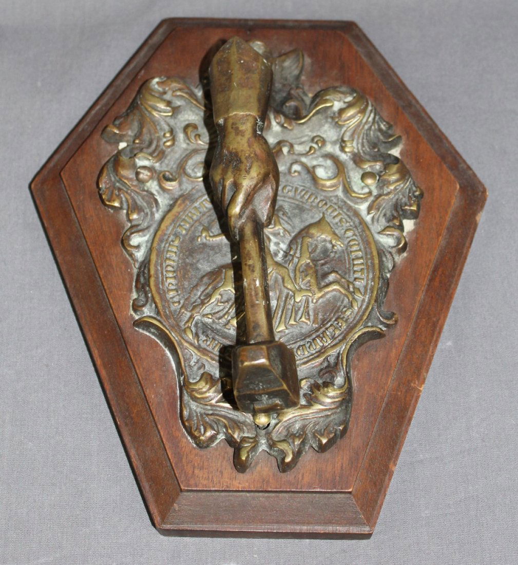 SoldFrench polished bronze door knockerFrench polished bronze door knocker mounted on board. 7"h (door knocker measurement only).See Sold Price