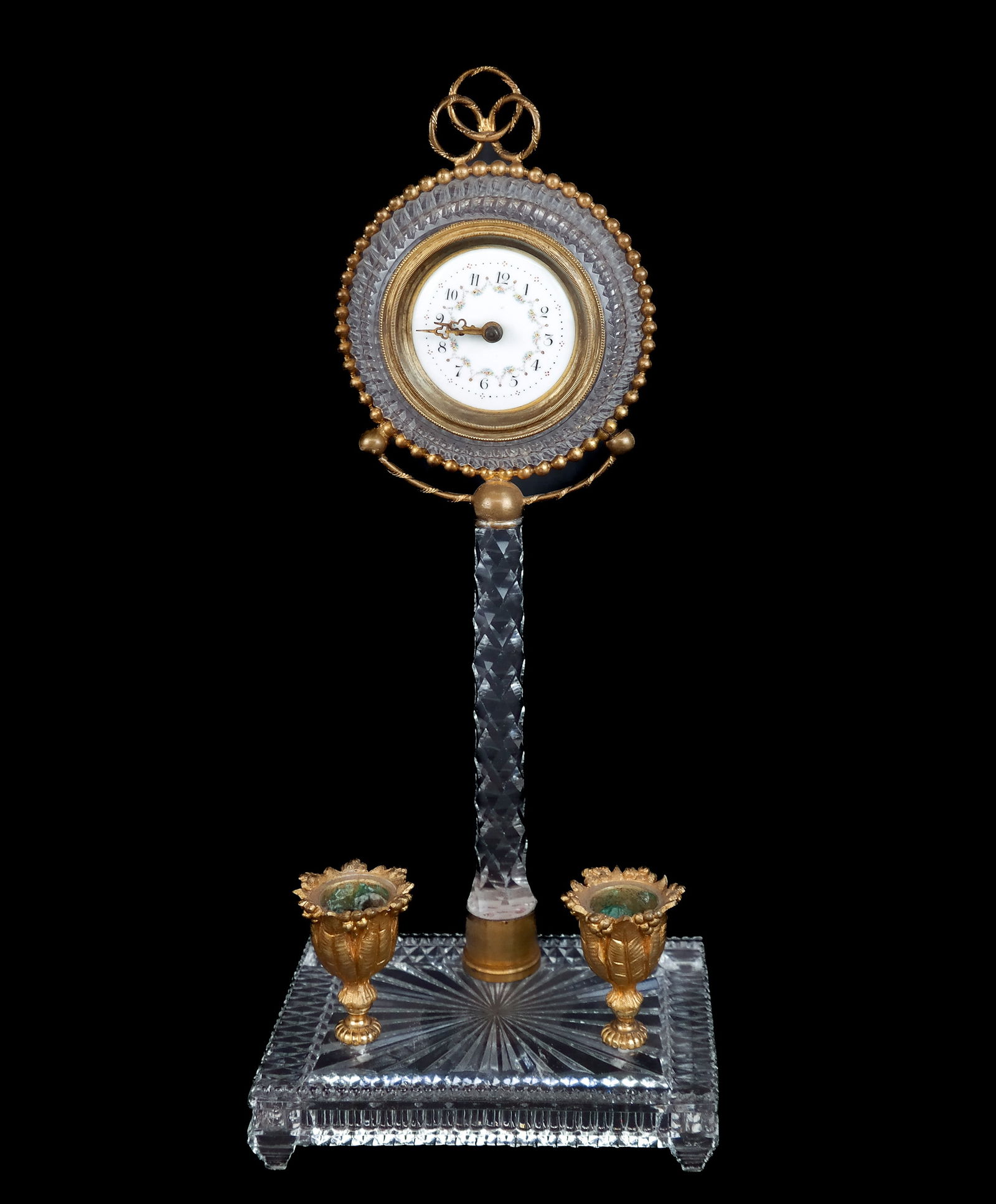 SoldFrench Bronze-Mounted Desk ClockEnamel-face clock in bronze frame with glass frame on crystal post mounted on a bronze candlestick, mounted on a pressed glass base. [14" H x 6" W x 4" D].See Sold Price