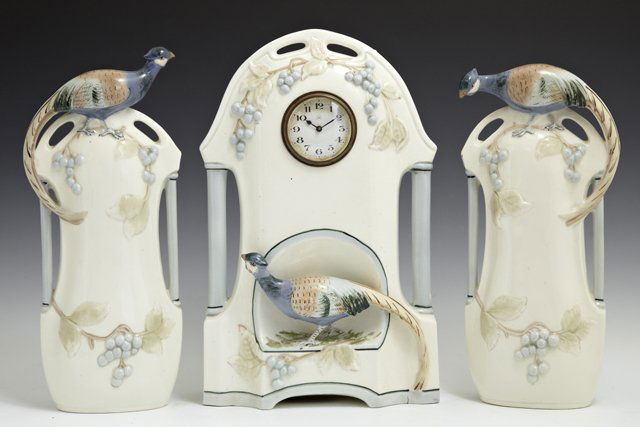 French Ceramic Three Piece Clock Set, c. 1930, the