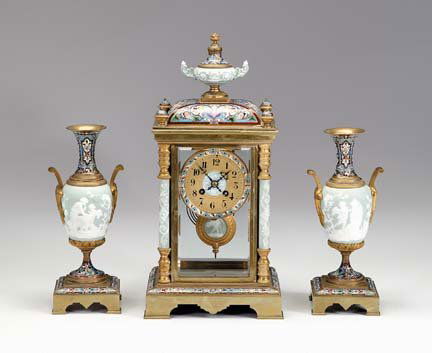 French champleve enamel & jasperware clock garnit