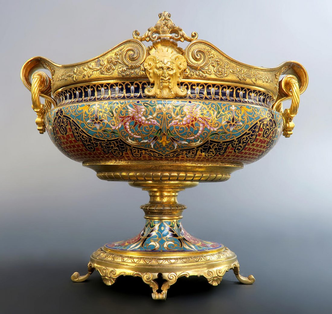 SoldFrench Sevres Champleve Enamel & Bronze CenterpieceA French Sevres Champleve Enamel & Bronze Centerpiece. H 5" x 10" x 8"See Sold Price