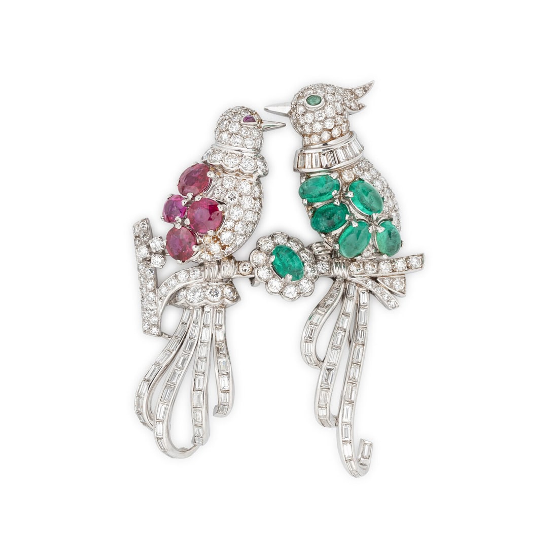 FRENCH, DIAMOND, EMERALD AND RUBY CONVERTIBLE BIRD BROOCH