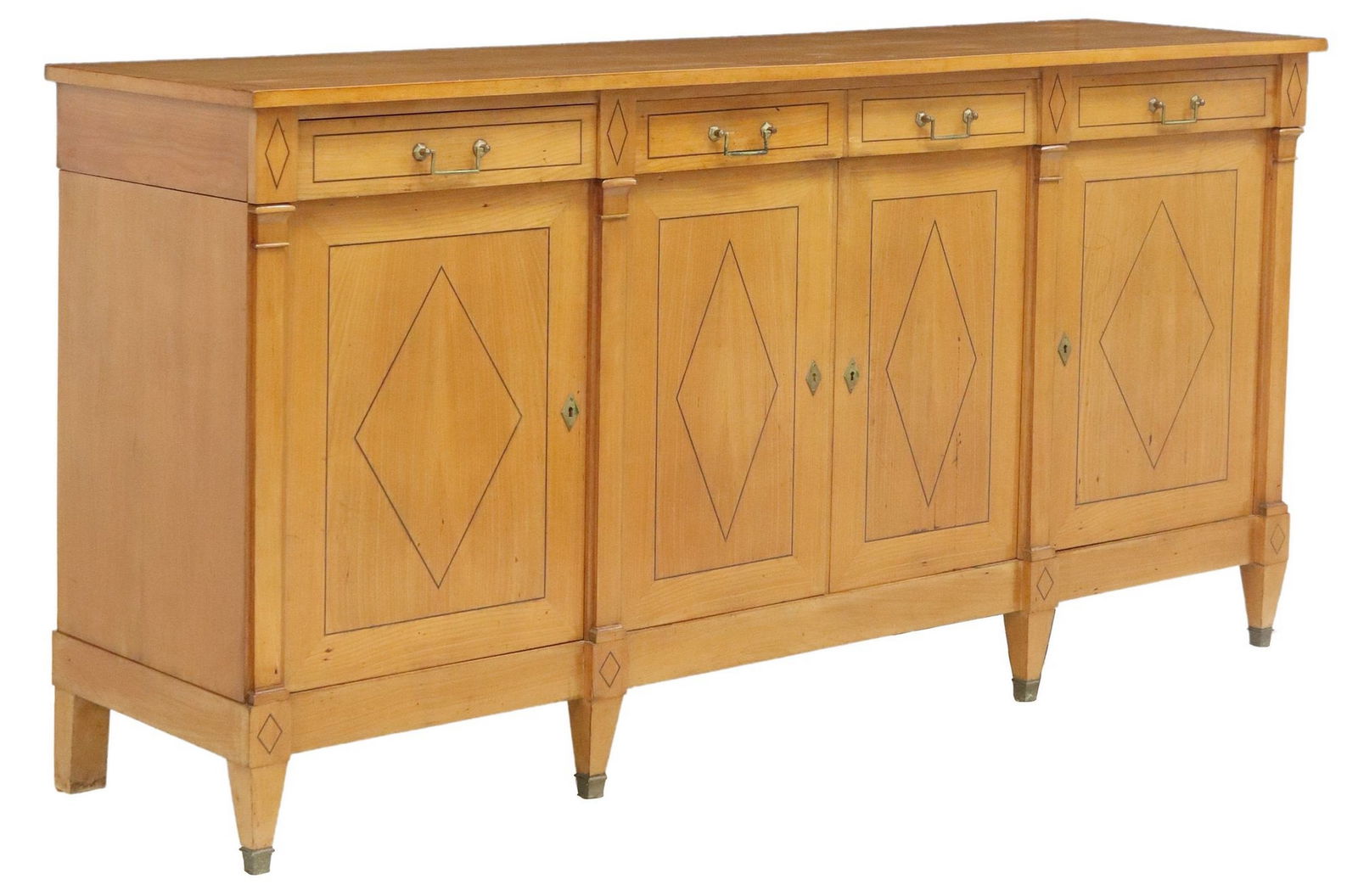SoldFRENCH DIRECTOIRE STYLE FRUITWOOD SIDEBOARDFrench Directoire style fruitwood sideboard, early 20th c., three drawers, over three cabinet doors, interior shelf, rising on tapering square legs, approx 38.75"h, 72.75"w, 19.75"d Start Price: $500.See Sold Price