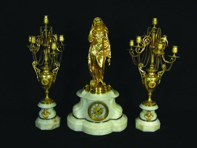 FRENCH DORE BRONZE AND MARBLE THREE PIECE CLOCK SET