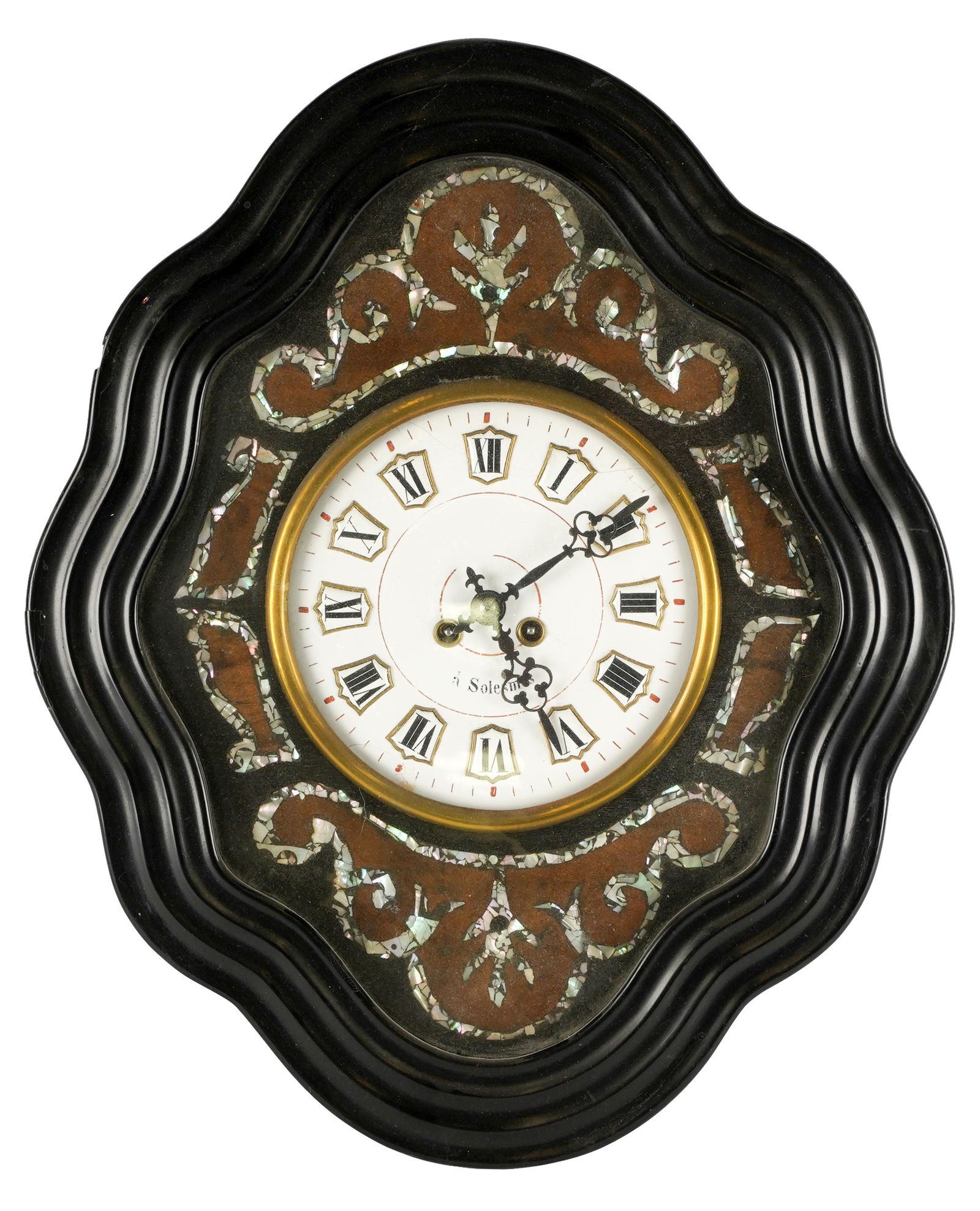SoldFRENCH EBONY WALL CLOCKwith enamel dial inscribed "a Solesmes"; the case inlaid with shell Condition: wear dial; working condition unknown; 22 1/2 inches high; 18 inches wide; 5 1/4 inches deepSee Sold Price