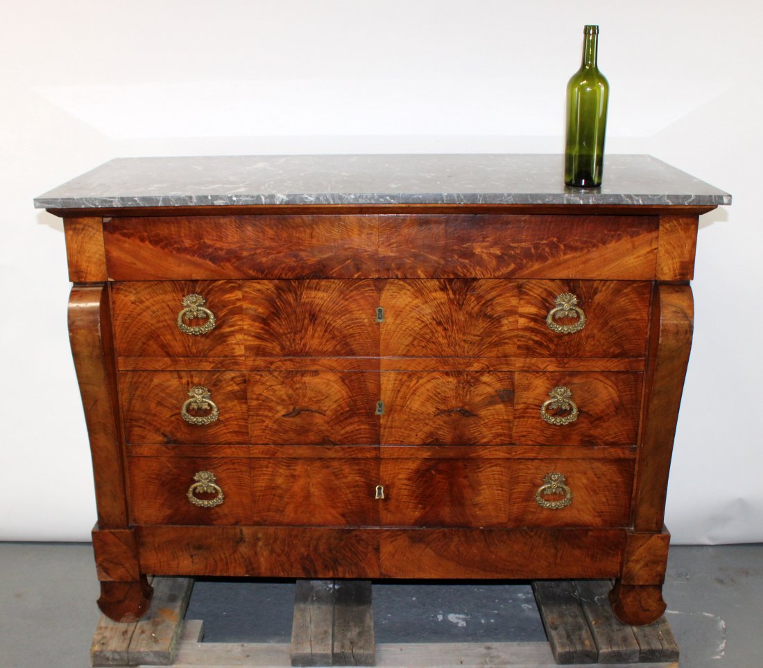 French Empire commode in burled walnut with marble top
