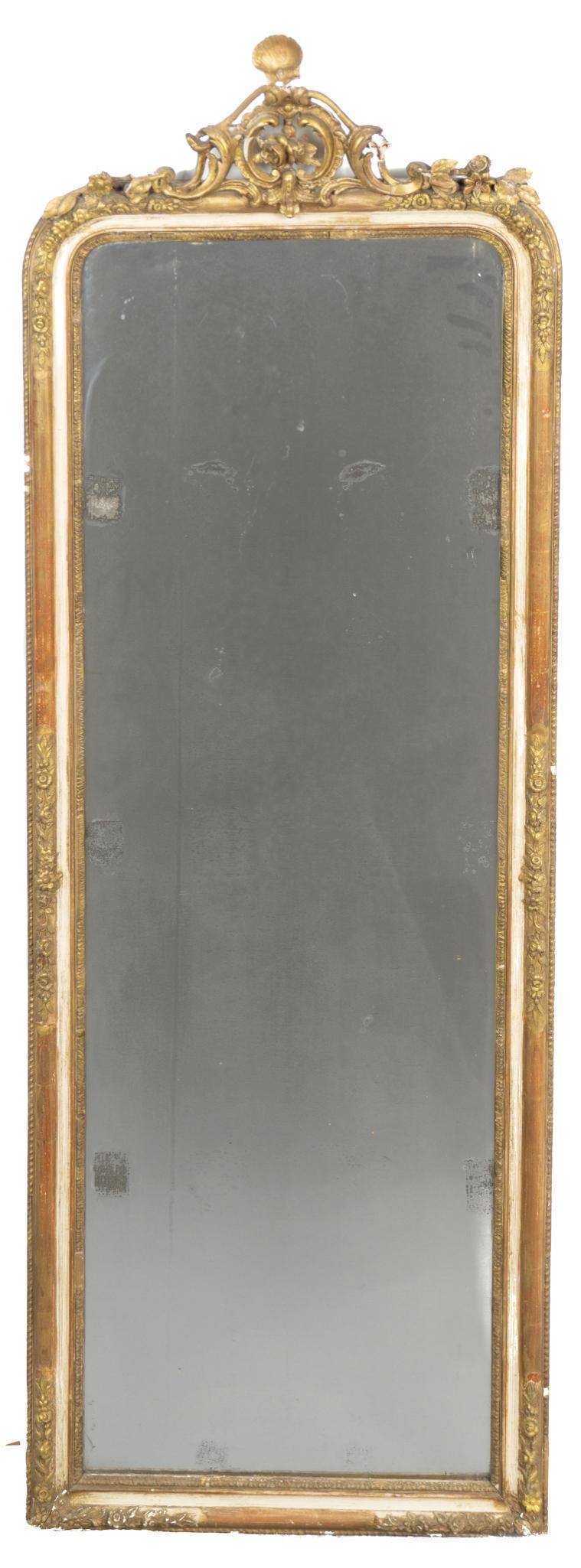 SoldANTIQUE FRENCH GILT FRAMED MIRRORAntique French mirror, c. 1900, the gilt pierced foliate and scrolled frame with protruding top around a beveled mirror plate, 49"h, 30"w Start Price: $100.00See Sold Price