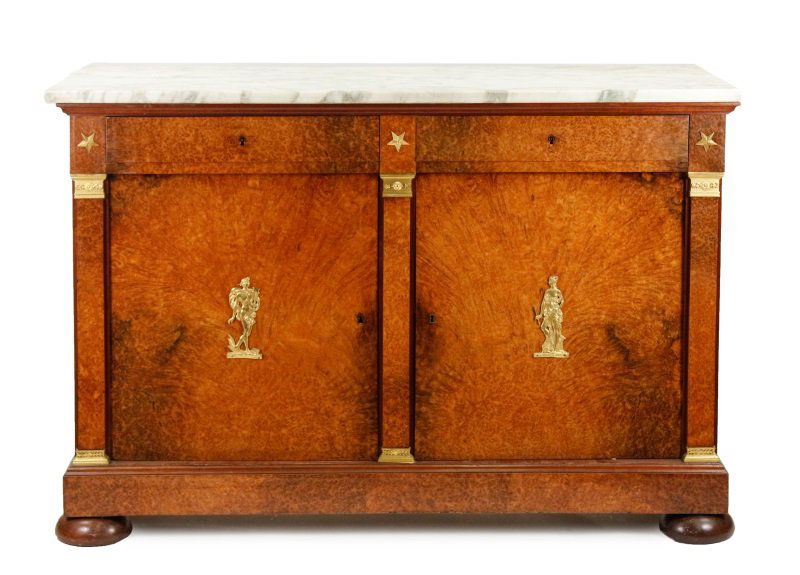 SoldFrench Empire Style Ormolu & Walnut Server BuffetFrench, late 19th/early 20th century. French Empire style ormolu mounted burl walnut server or buffet with rectangular white and gray marble top over a frieze mounted with ormolu stars centering a paiSee Sold Price