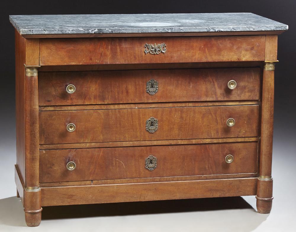 French Empire Style Ormolu Mounted Marble Top Bronze Center Table, 20th c., H.- 34 in., Dia.- 43 in.French Empire Style Ormolu Mounted Marble Top Bronze Center Table, 20th c., the round marble top over a bronze mounted apron with upper and lower gilt trim, triple winged monopod legs with gilt stretc