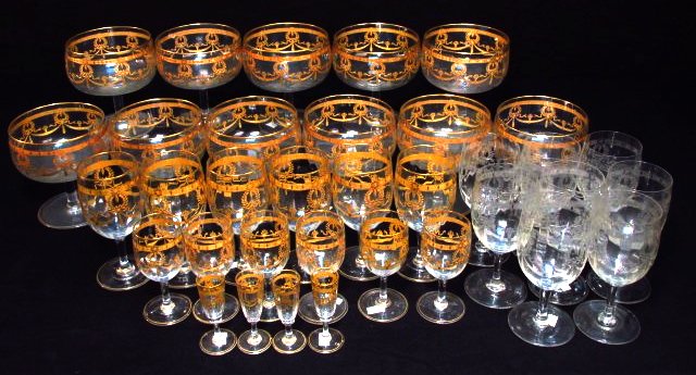 FRENCH ETCHED & GILDED CRYSTAL STEMWARE: 35 PCS