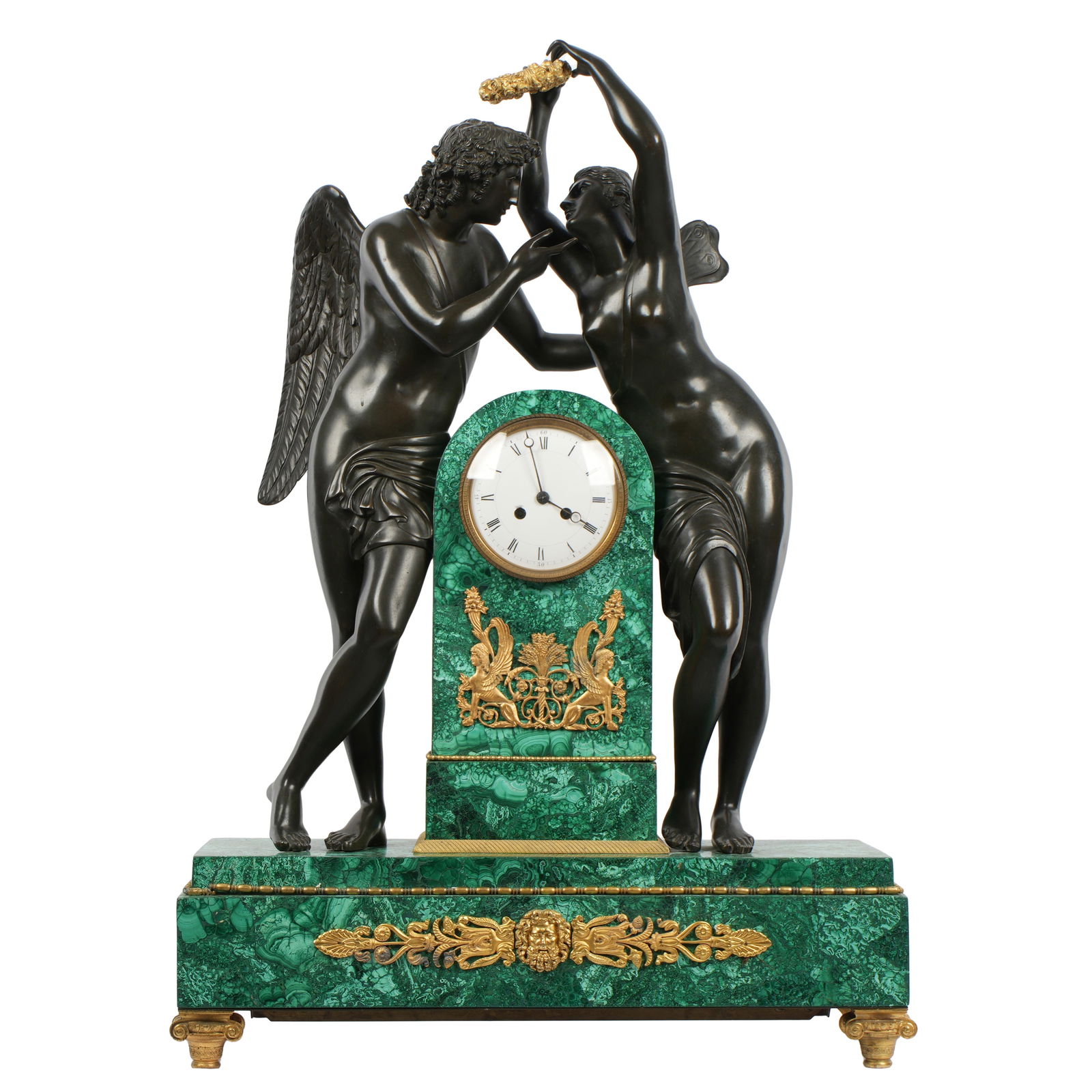 French Figural Bronze and Malachite Mantle Clock