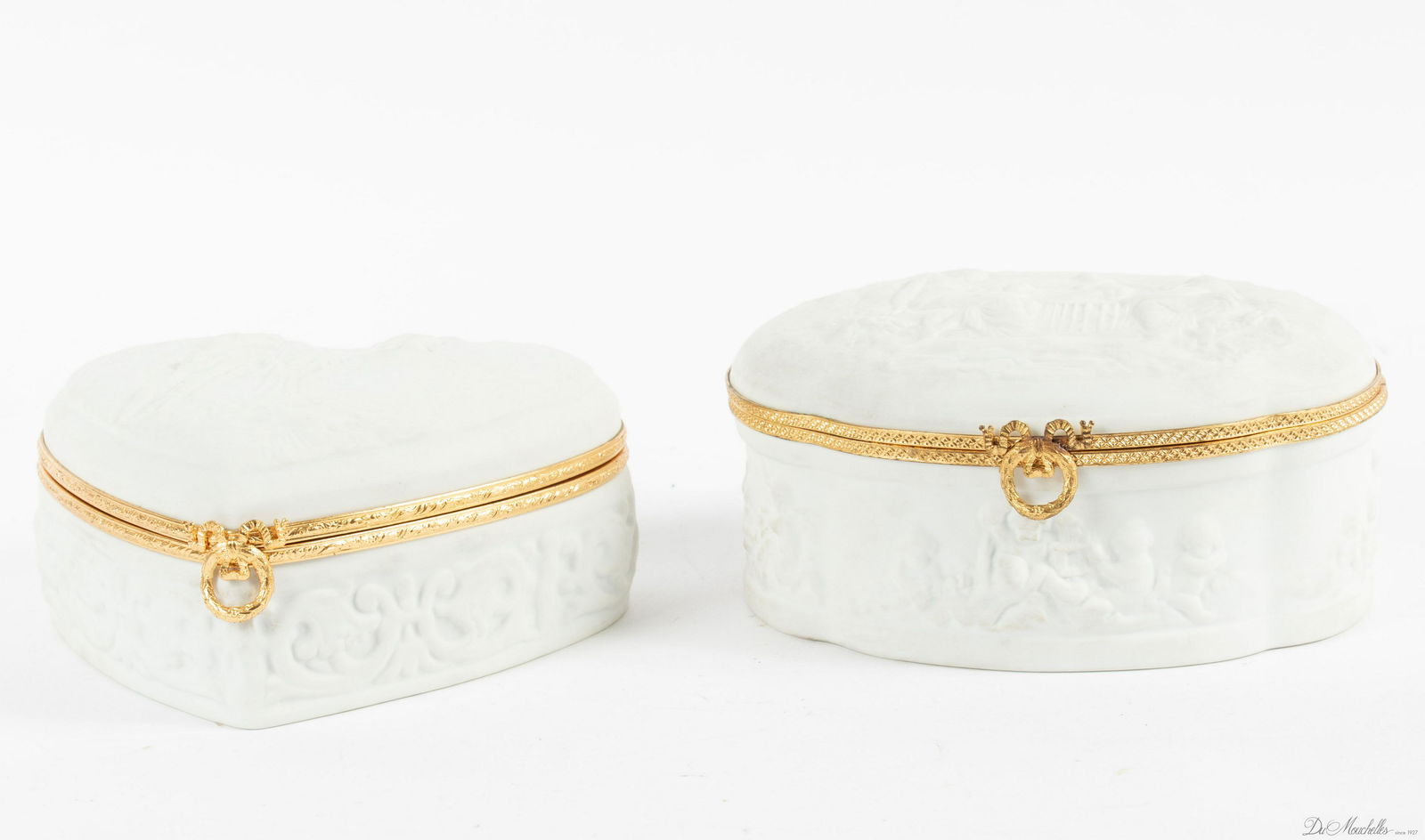 FRENCH LIMOGES BISQUE COVERED HINGED BOXES W 6", 7"