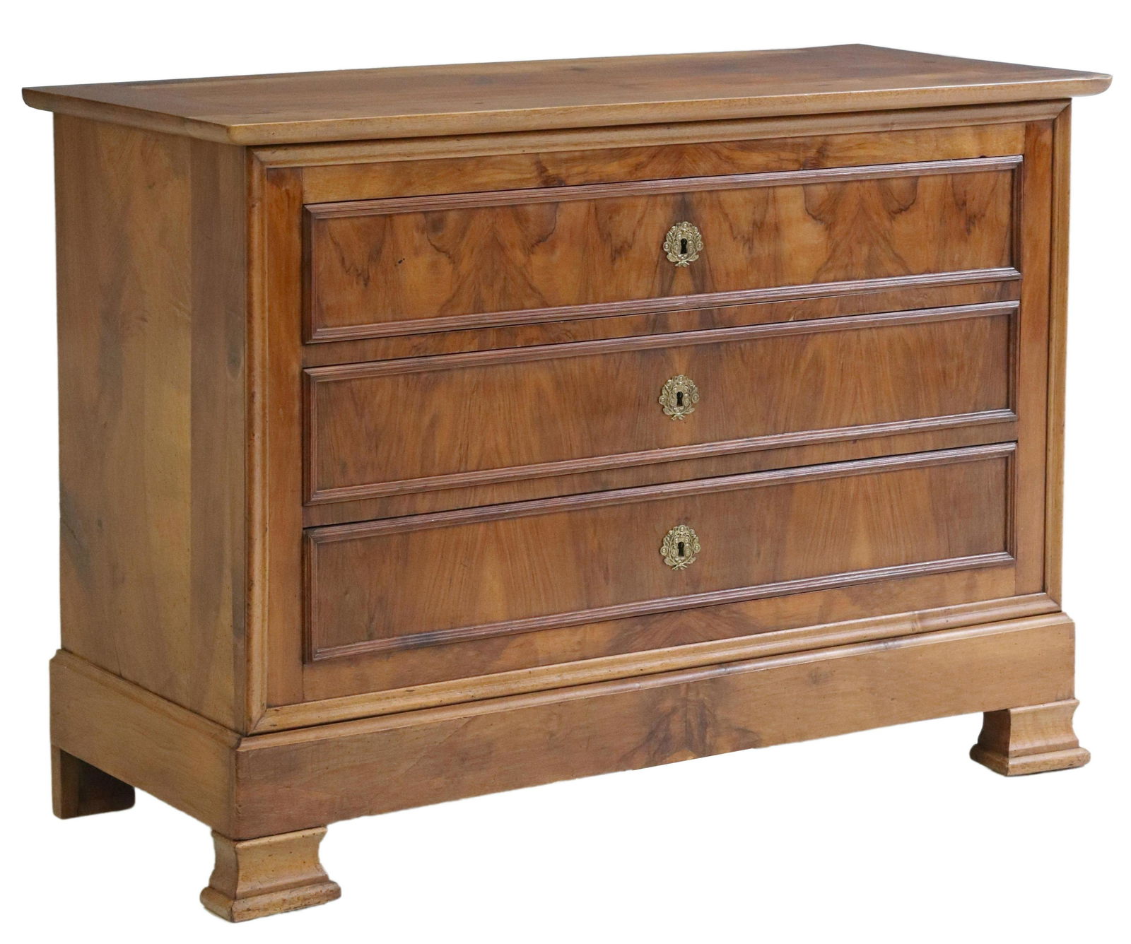 French Louis Philippe Carved Walnut Commode, mid 19th c., H.- 37 1/2 in., W.- 48 1/2 in., D.- 21 1/2French Louis Philippe Carved Walnut Commode, mid 19th c., the shaped top above a cavetto frieze drawer over three drawers, atop a plinth base on bracket feet, H.- 37 1/2 in., W.- 48 1/2 in., D.- 21 1/