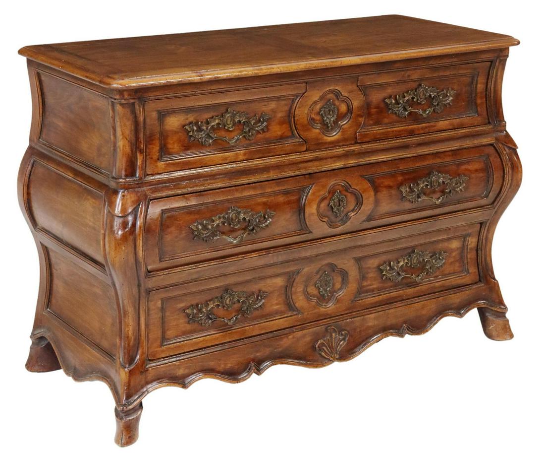 SoldFRENCH LOUIS XV STYLE CARVED WALNUT COMMODEFrench Louis XV style bombe commode, 20th c., having shaped top, over three drawers with mounted gilt metal escutcheons, carved rocaille apron, rising on cabriole legs, approx 35.25"h, 47.25"w, 20"d SSee Sold Price