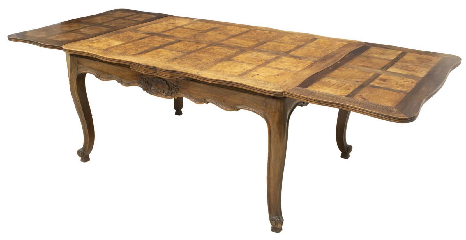 SoldFRENCH PROVINCIAL LOUIS XV STYLE DRAW-LEAF TABLEFrench Provincial Louis XV style oak draw-leaf dining table, 20th c., having shaped parquetry top with two built-in leaves, foliate scroll carved apron and knees, rising on cabriole legs, ending in whSee Sold Price