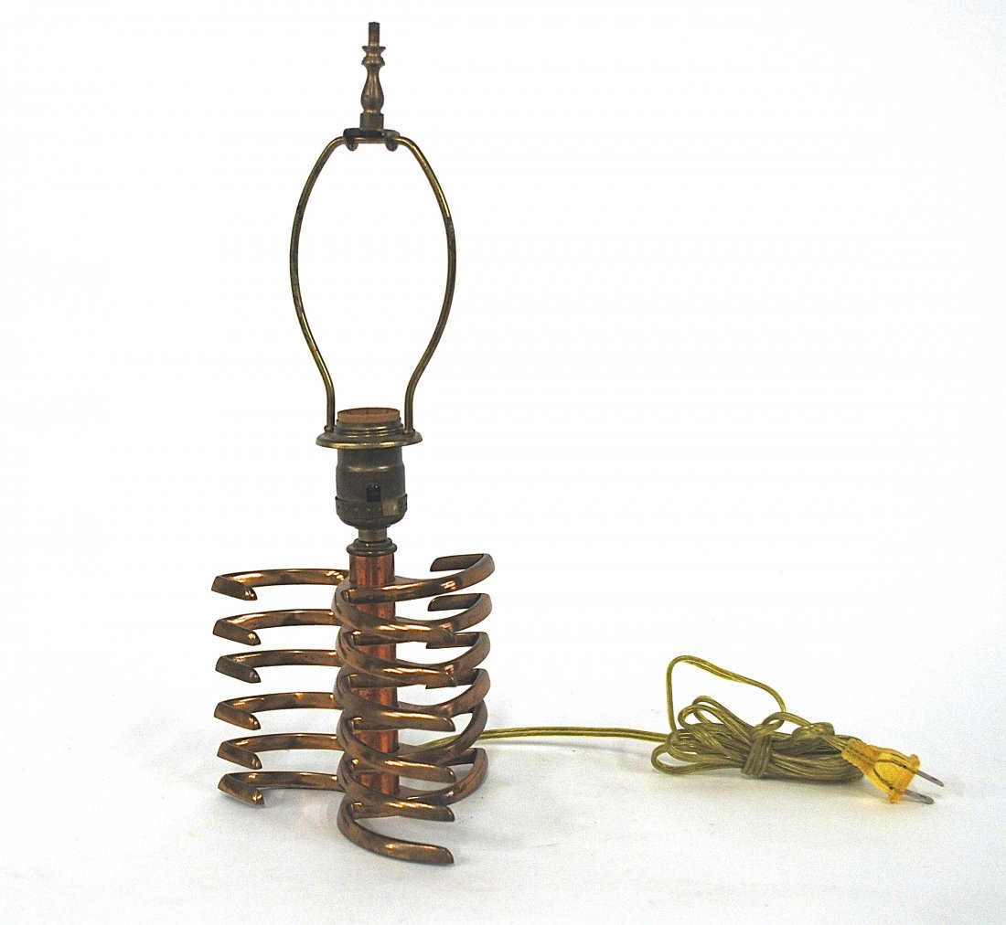 SoldArt Deco Machine Age Desk LampLot 254 Art Deco Machine Age Desk Lamp copper Art Deco Machine Age copper table lamp, with round shade hanging from half circle curved stem that attaches to a circular base 11 x 9 1/2 x 8 inches ProvSee Sold Price