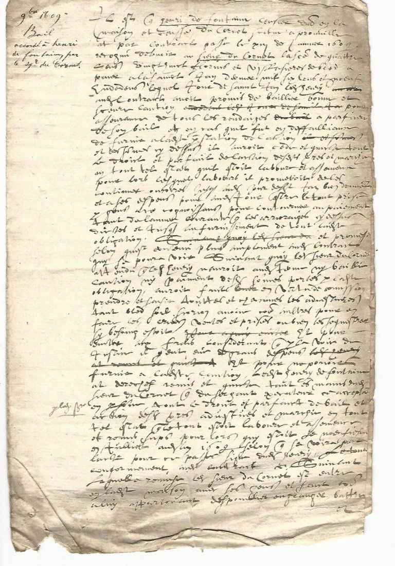 SoldEarly French Manuscript Legal Document, 1609Item: Early French Manuscript Legal Document Date: 1609 Size: 7 x 11 inches An early manuscript lease in French on paper dated 1609. Three pages. Signature at end, most probably of a notary. Dated atSee Sold Price