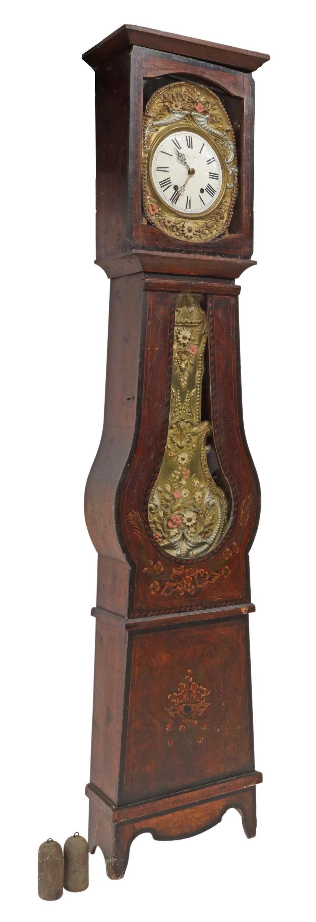 FRENCH MORBIER GRAIN PAINTED PINE LONG CASE CLOCK
