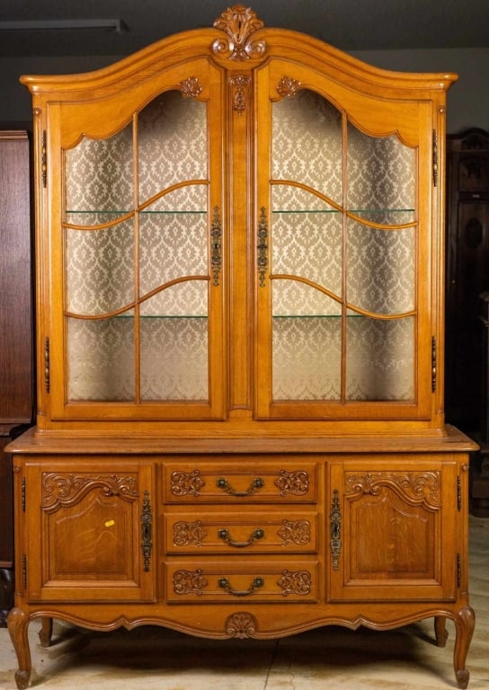 SoldFRENCH OAK VITRINE DEUX CORPSFrench oak vitrine deux corps with cabriole legs, carved galleries, carved crest, and carved inset panels. Approximate dimensions: h. 83", w. 86", d. 21" Disclaimer: This is an online court ordered baSee Sold Price