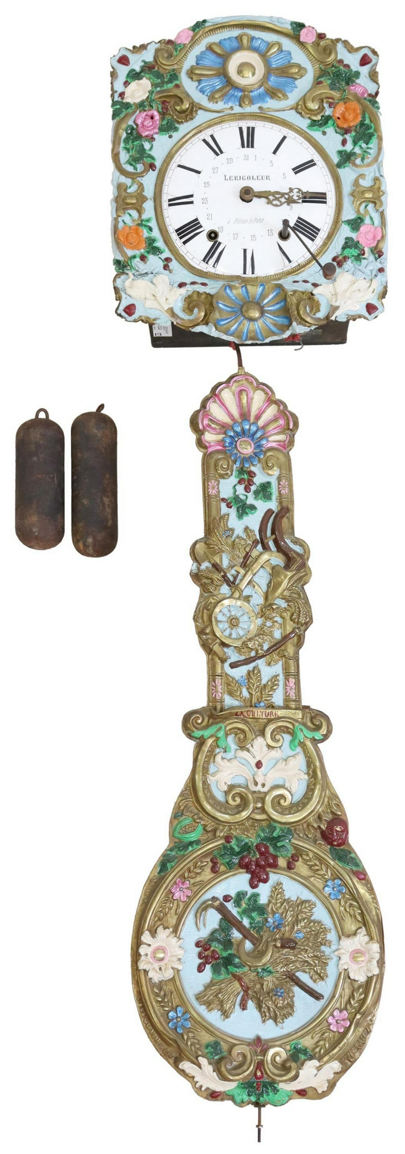 FRENCH POLYCHROME COMTOISE WALL CLOCK, 19TH C.