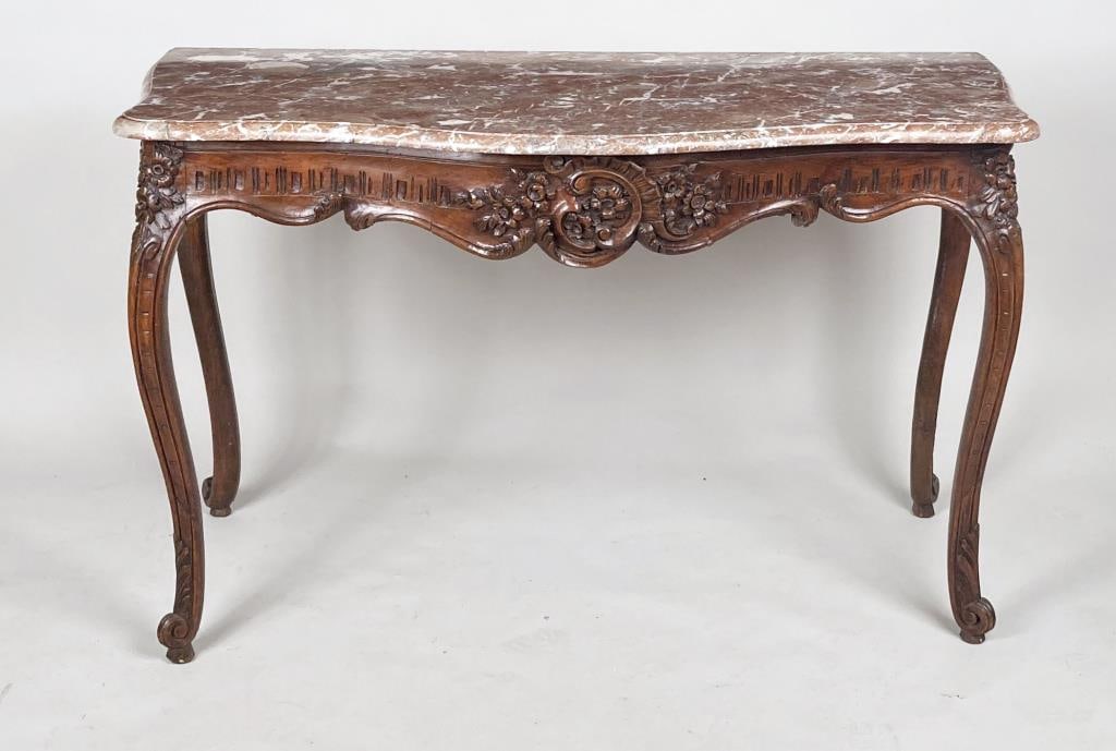 Victorian Walnut Console Table with Marble TopMar 07, 2026LOUIS XV STYLE CARVED OAK WALL-MOUNTED CONSOLE TABLE2 days LeftElegant Louis XV Style Mahogany Console Table with Marble TopFeb 26, 2026Elegant French Carved Walnut Dining Table with 2 Leaves7 days LeftWalnut Victorian Square Center TableMar 07, 2026VICTORIAN CONSOLE SERVING TABLE4 days LeftFrench Provincial Style Carved Oak Writing Table21 hrs LeftFrench Louis XV Style Mahogany Writing Table, 20th c., H.- 29 1/4 in., W.- 41 1/4 in., D.- 19 3/4Feb 27, 20261920s Antique Walnut and Marble Top Side Table With Carved Swan Motifs19th Century Louis XV Console Table with Breche d'Alep Marble Top935 Lots AwayParlor Table, Turtle Top With White Marble, Walnut With Carved Fruit & Fruit BasketMar 21, 2026French console table with faux marble top.6 days Left18th Century French Louis XIV Bleached Walnut Console Table with Breccia Marble Top2 days LeftMaitland Smith Ball & Claw Chippendale Mahogany Tea TableMarble Top Rococo Style Mahogany Table With Carved Paw FeetENGLISH MAHOGANY LIBRARY TABLEMar 07, 2026