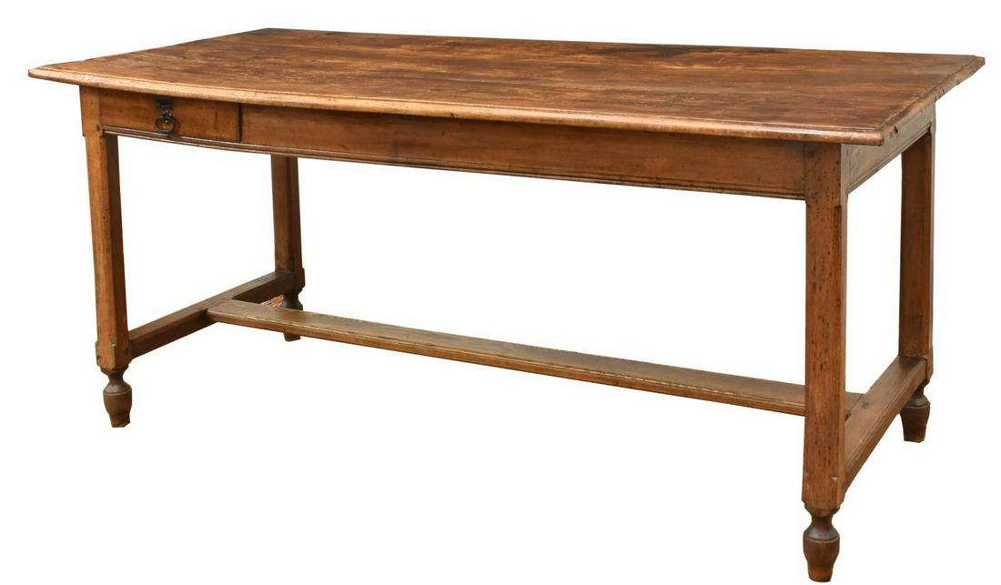 SoldFRENCH PROVINCIAL FARMHOUSE LONG TABLE, 138"LFrench Provincial farmhouse table, 19th c., long plank top, over single frieze drawer, rising on turned legs, joined by H stretcher, approx 30.75"h, 138.25"l, 35"w Start Price: $800.00See Sold Price