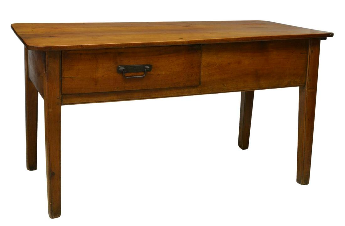 SoldFrench Provincial Single Drawer Table, 19th C.French, late 19th century. A French Provincial fruitwood work table or desk, having an overhanging rectangular top, the apron fitted with a small drawer with a central wrought iron pull, standing on fSee Sold Price