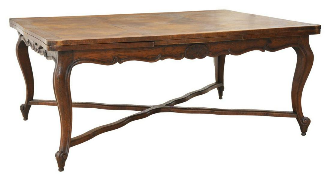 French Provincial Eight Piece Figural Carved Oak Dining Room Suite, 20th c., Brittany, consisting ofFrench Provincial Eight Piece Figural Carved Oak Dining Room Suite, 20th c., Brittany, consisting of a sideboard, 6 chairs and a drawleaf dining table, the sideboard with a stepped ogee crown over a s