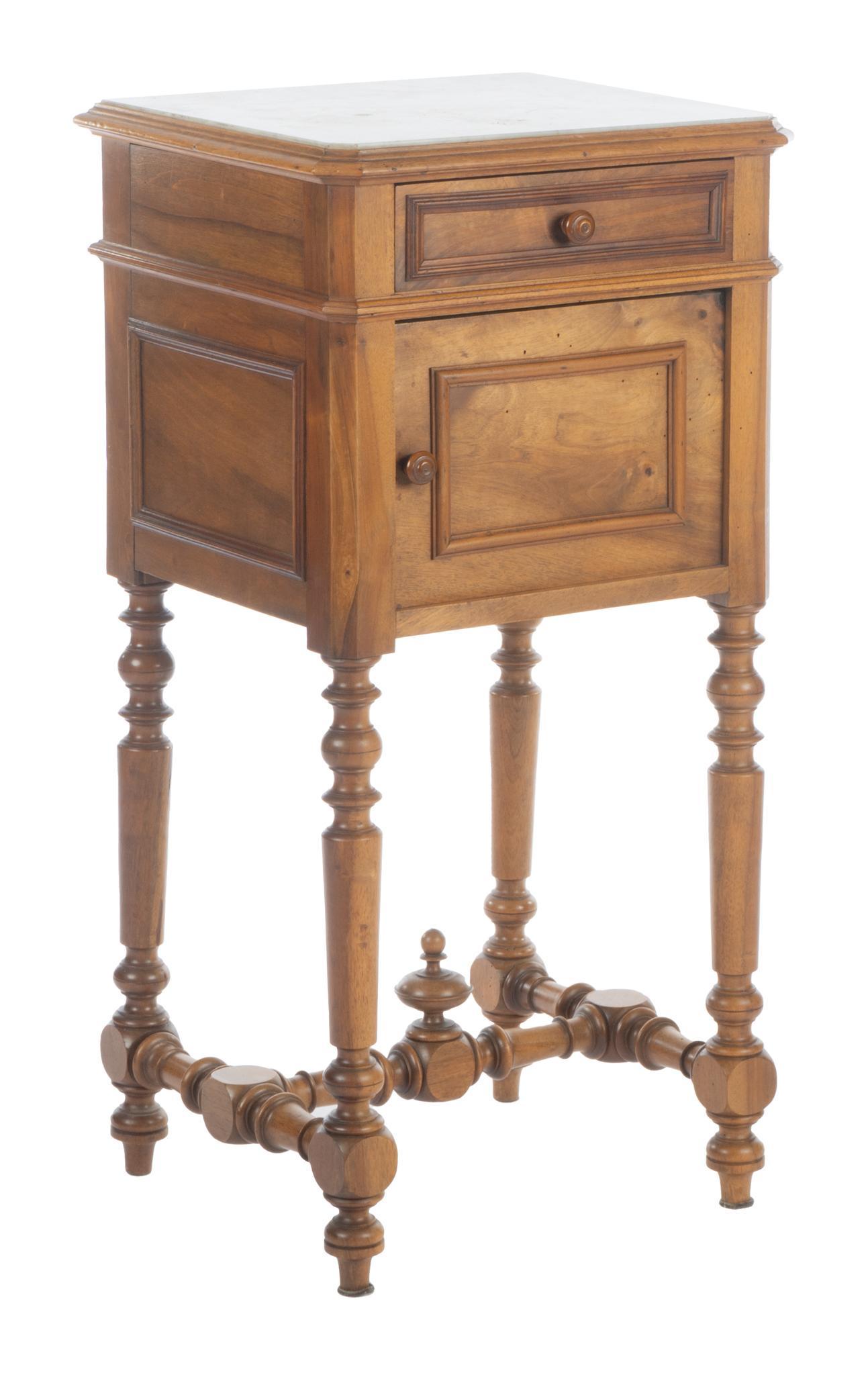 French Provincial Louis XVI Style Carved Cherry Nightstand, 20th c., the rectangular top over a bankFrench Provincial Louis XVI Style Carved Cherry Nightstand, 20th c., the rectangular top over a bank of three drawers, on tapered square legs with ormolu sabots, H.- 28 1/2 in., W.- 21 3/8 in., D.- 14