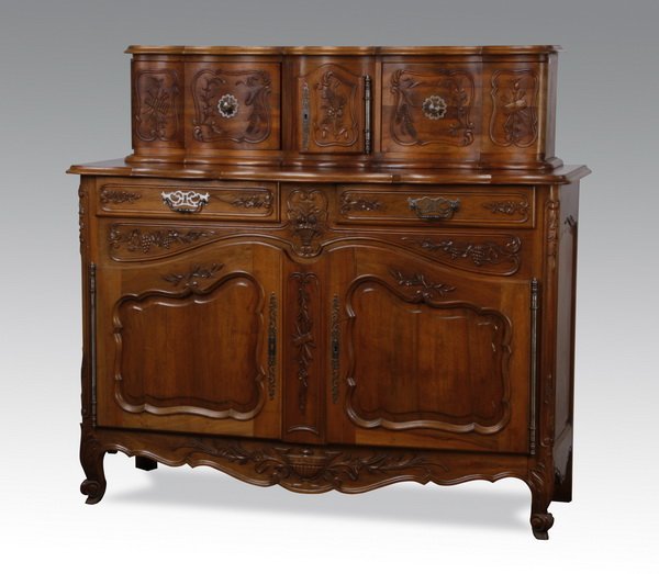 SoldFRENCH PROVINCIAL LOUIS XV STYLE CARVED WALNUT BUFFET DEUX CORPSFrench Provincial Louis XV style carved walnut buffet deux corps, 19th c., upper case fitted with three cabinet doors flanked by fluted pilasters, above two drawers and dual cabinet doors, carved withSee Sold Price